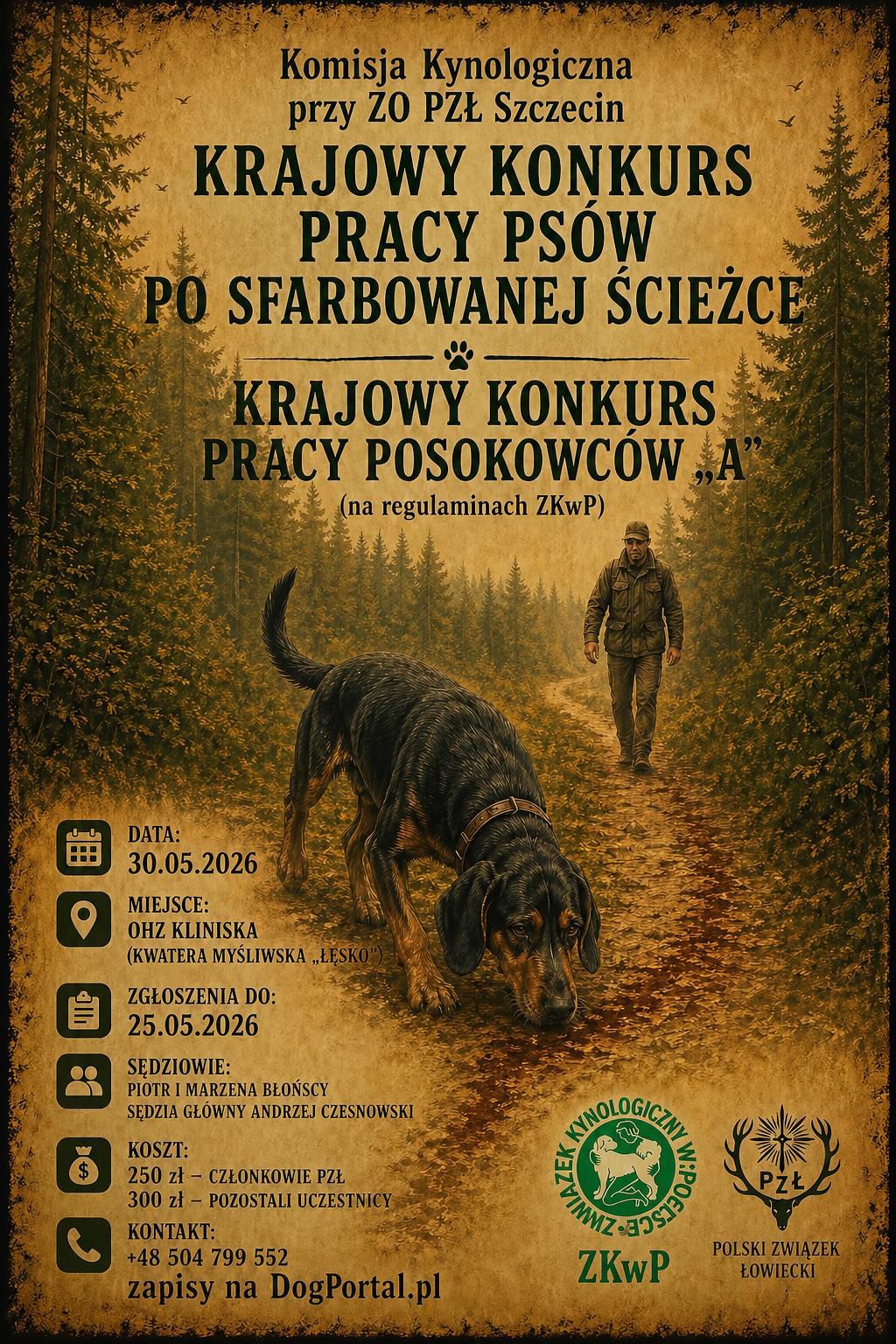 KRAJOWY KONKURS PRACY PSÓW PO SFARBOWANEJ ŚCIEŻCE oraz KRAJOWY KONKURS PRACY POSOKOWCÓW „A” (według regulaminów ZKwP),  które odbędą się w dniu 30 maja 2026 r. (sobota) w OHZ Kliniska (kwatera myśliwska „Łęsko).